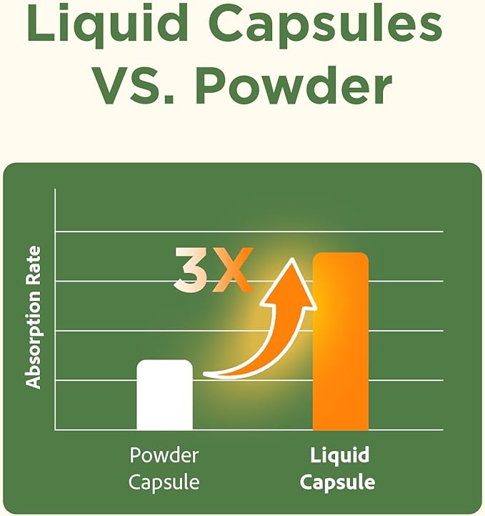 - [Liquid-Filled Capsules for 3X Better Absorption]: Traditional powders and tablets slow nutrient delivery. Our oil-based liquid capsulesensure faster absorption and 3X higher bioavailability.Oil-based nutrients bypass the digestive breakdown process. Key fat-soluble ingredients like Bergamot Extract and Tocotrienols dissolve optimally in MCT oil, delivering faster results with every dose.