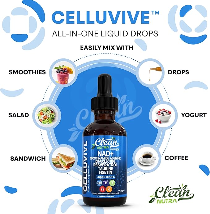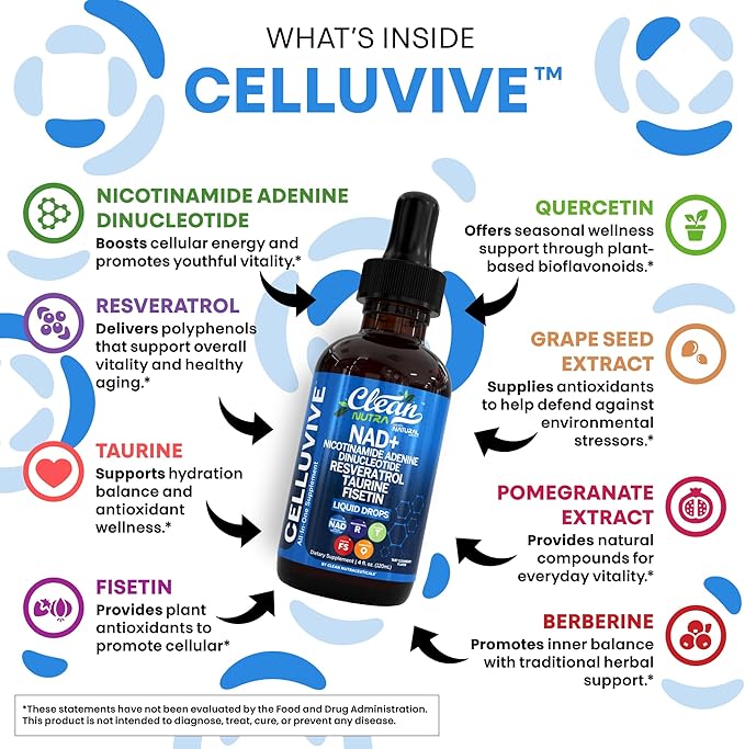 - Advanced NAD cellular longevity support for men and women: Clean Nutraceuticals blends bioactive NAD+ precursors with powerhouse antioxidants including resveratrol, resveratrol supplement-grade polyphenols, taurine, fisetin, vitamin C, quercetin, berberine, pomegranate and acai to help neutralize oxidative stress, recharge mitochondrial energy, nurture brain clarity, bolster immune response and maintain youthful vitality in every fast-absorbing liquid serving—no chalky capsules required.