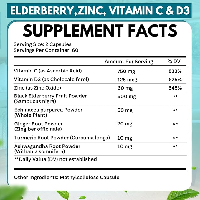 - Exclusive Elderberry & Zinc Blend - Featuring a unique blend of Elderberry and Zinc, our supplement provides over 2 times the daily recommended value. With 60mg of Zinc and 500mg of Elderberry Extract per serving, this formula delivers robust antioxidant and immune support, helping you stay healthy year-round.