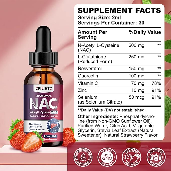 - Advanced Liposomal NAC Supplement: CFILIHTC NAC Supplement N-Acetyl Cysteine Liquid Drops delivers NAC 600mg per serving, combined with Glutathione, Resveratrol, Quercetin, Zinc, Vitamin C and Selenium to support antioxidant defense, liver detoxification, immune function, cellular health, and respiratory wellness. This comprehensive formula helps reduce oxidative stress, promote glutathione production and enhance overall vitality