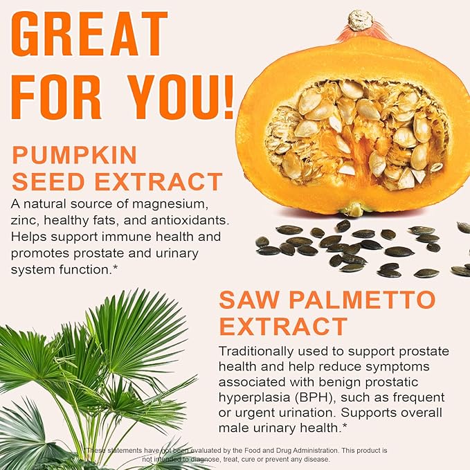 - Dual-Action Urinary Support Formula- Our cold-pressed pumpkin seed oil delivers 1,000mg per serving, paired with saw palmetto extract (4:1 ratio). This blend provides plant-based nutrients like zinc and phytosterols to support urinary function and comfort in men