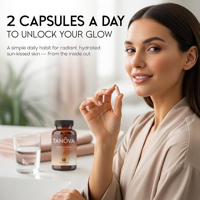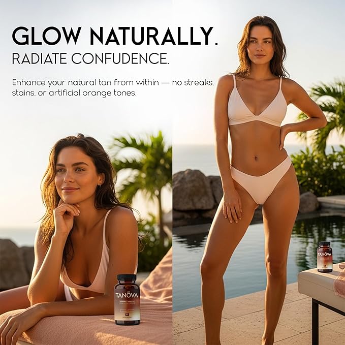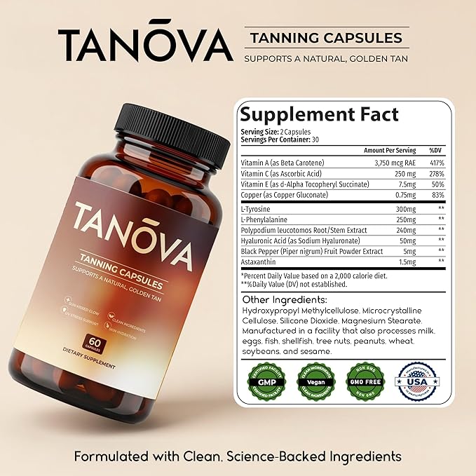 - Tanova Tanning Capsules: Achieve a radiant, golden tan like never before — naturally and effortlessly — with Tanova, the premium daily supplement for glowing skin from within. Powered by science-backed ingredients like Astaxanthin, L-Tyrosine, and Copper Gluconate, Tanova supports your body’s natural melanin production — the pigment responsible for deepening skin tone. Even with minimal sun exposure, you can enjoy a warm, sun-kissed glow year-round without compromising your skin’s health.
