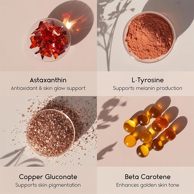 - Product Benefits : Anti-Aging, Boosts Natural Melanin, Faster & Deeper Tanning, Glow with Less Sun, Hydrates & Smooths Skin, Supports Skin Health Under Sun Exposure Anti-Aging, Boosts Natural Melanin, Faster & Deeper Tanning, Glow with Less Sun, Hydrates & Smooths Skin, Supports Skin Health Under Sun Exposure
