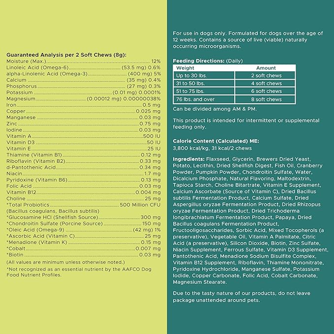 - There are 60 of our pet vitamin and supplement soft chews per bottle, each one has a delicious chicken flavor. Good for all breeds and for small, medium, and large dogs. See the packaging for serving recommendations.