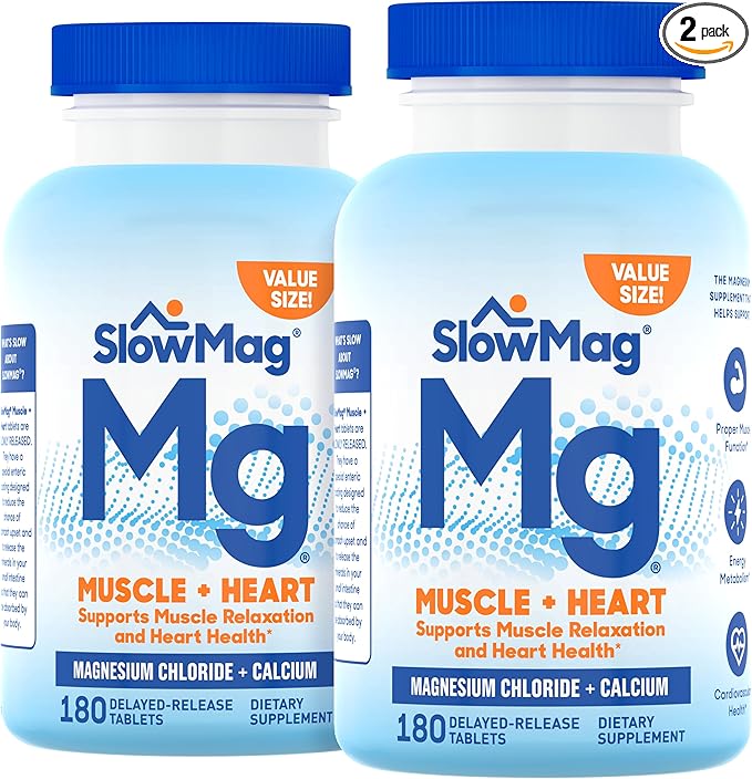SlowMag Muscle & Heart Magnesium Chloride Supplement with Calcium, 180 Count, Supports Muscle Relaxation, Heart, Nerve & Bone Health, High Absorption (Pack of 2)