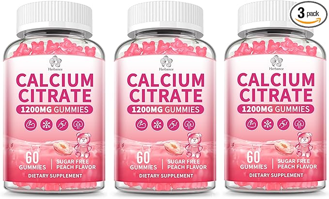 (3 Pack) Calcium Citrate Gummies 1200 mg for Adults, High Absorption Calcium Supplement for Women & Men, Sugar Free, Non-GMO, Gluten Free, Supports Muscle & Immune - Natural Peach Flavor