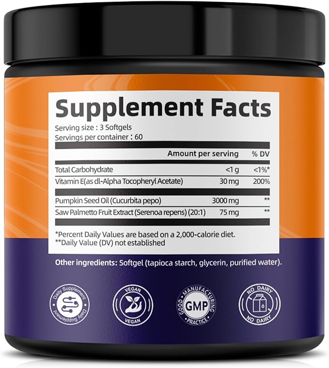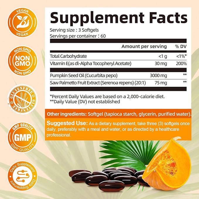 - [3-IN-1Powerful Formula]: Formulated with natural plant ingredients, Our through high concentration cold pressing extraction, scientifically combines 3,000mg pure pumpkin seed oil, 75mg saw palmetto fruit extract and 30mg vitamin E to synergistically support hair growth, skin elasticity, and prostate health.We Ensuring our formula for purity and potency, ensuring exceptional quality.