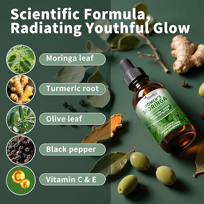 - Full of vitality, lasting vitality: The high-quality protein, multiple vitamins and minerals in Moringa, combined with turmeric root extract and olive leaves, work together to continuously supply energy to the body, help ease daily tiredness and support energy levels; black pepper promotes nutrient absorption, helps women regain vitality, stay energized, and calmly cope with multiple challenges in work and life.Our Moringa Liquid follows strict standards and is suitable for people who need kosher, halal, and gluten-free food, as well as people who adhere to vegan and vegetarian lifestyles.