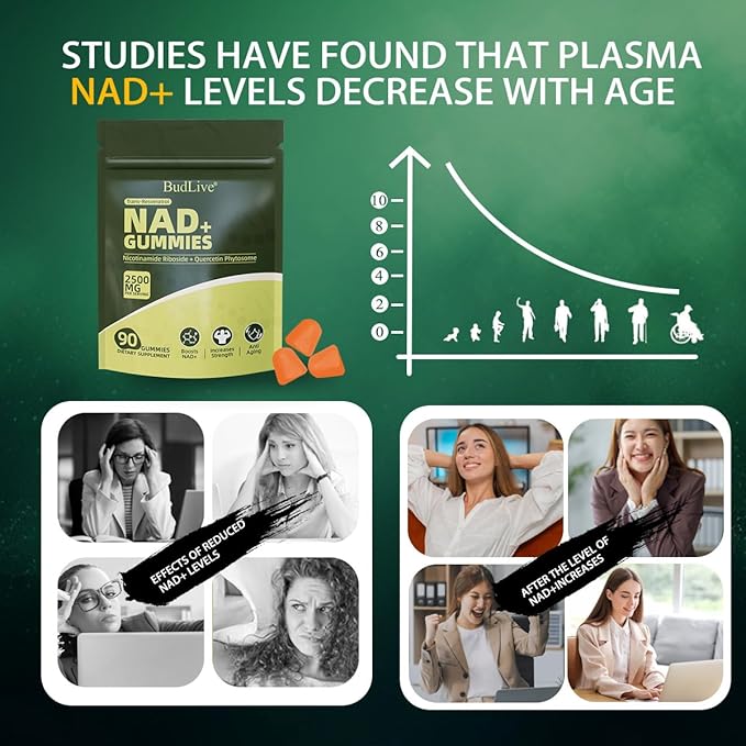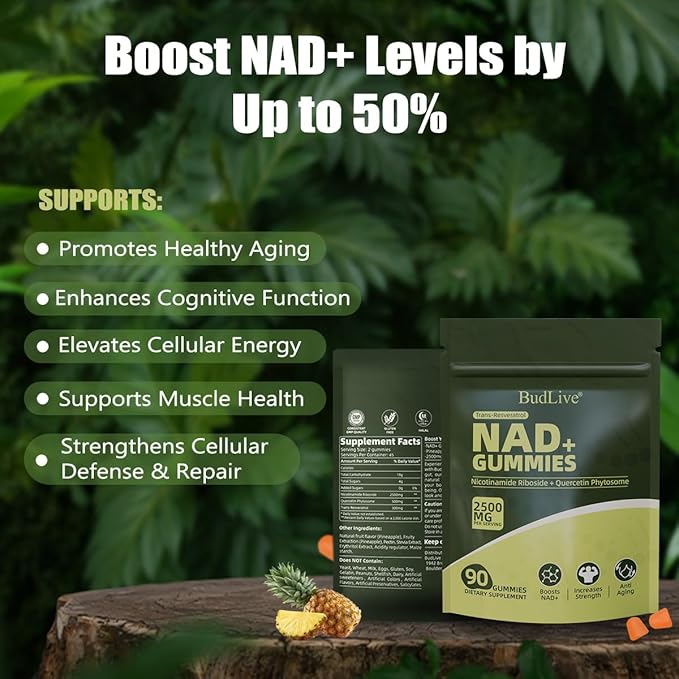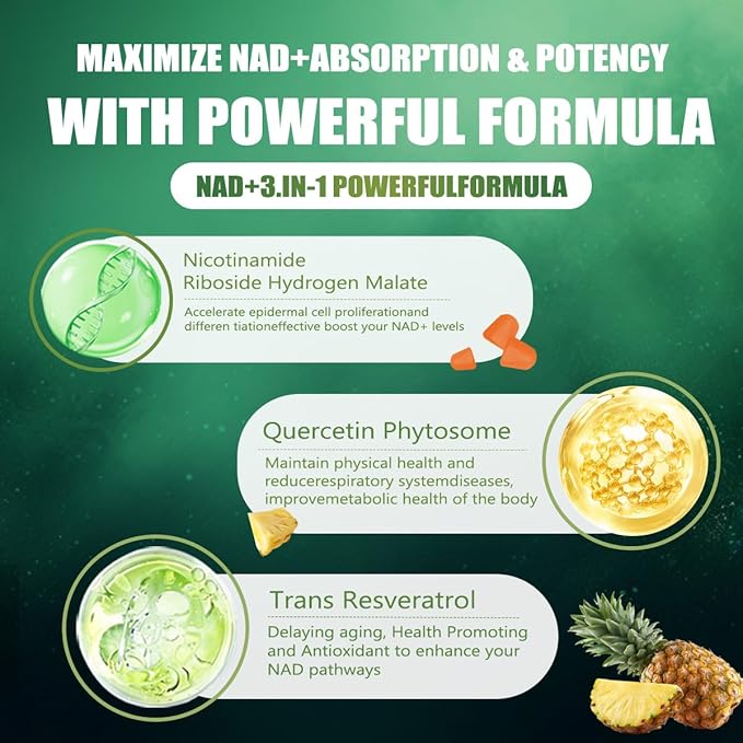 - POWERFUL 3‑IN‑1 NAD+ FORMULA – Delivers Nicotinamide Riboside, Quercetin & Trans‑Resveratrol in each sugar‑free gummy to support healthy skin aging, cellular repair, and overall vitality.