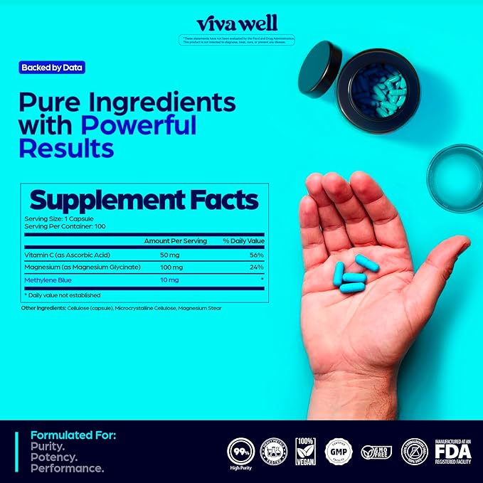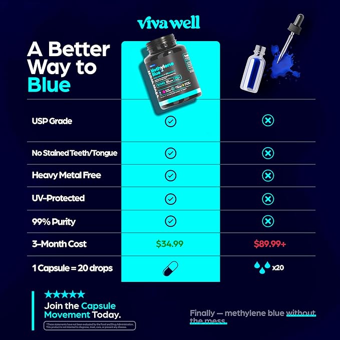 - 1 Capsule = 20 Drops: One high-strength capsule delivers the equivalent active compound found in up to 20 drops of methylene blue drops. NO messy glass droppers, NO blue stains. VivaWell's mythelene-blue inspired format is a pharmaceutical-grade solution—without stains, taste, or dropper hassle.