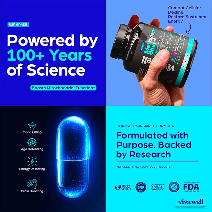 - #1 Supreme Methylene Blue: High-purity methylene blue capsules for humans, made with USP pharmaceutical-grade ingredients. Designed to support cellular energy, cognitive clarity, and mitochondrial health with consistent, daily use.
