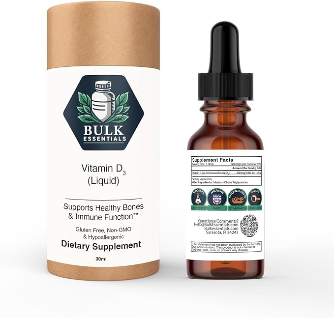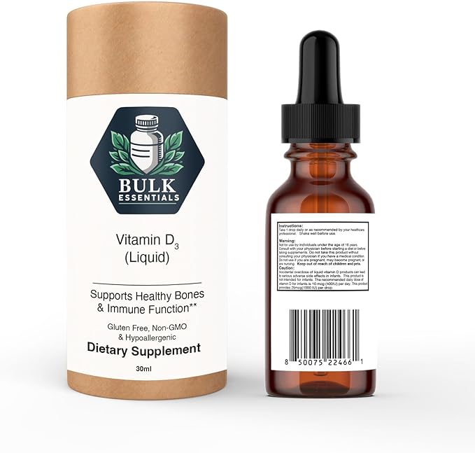 - Pure Sunshine in a Drop: Experience the power of Bulk Essentials organic vitamin D3 1000 IU per drop to help strengthen bones, improve calcium absorption, and enhance immune response. A simple way to support your body’s foundational needs year-round