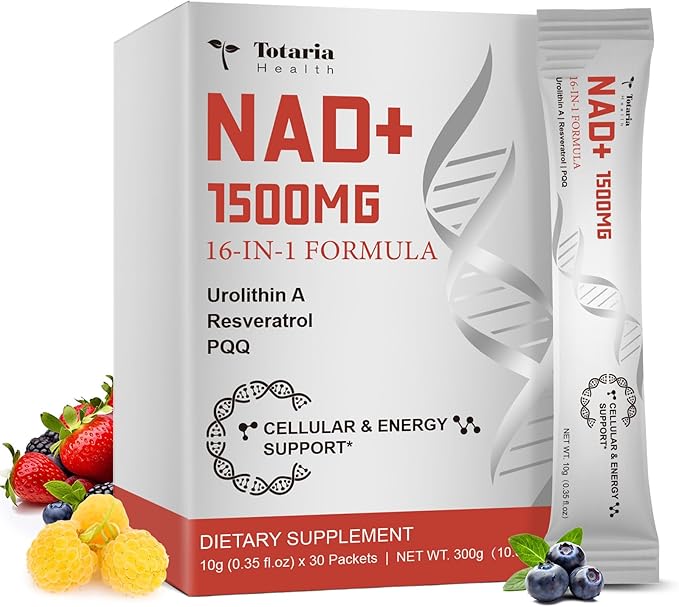 - 【16-in-1 Advanced NAD+ Formula】Totaria's premium NAD liquid supplement combines 1500mg of extra-strength NAD+ with 15 science-backed ingredients, including Resveratrol, Urolithin A, PQQ, CoQ10, Alpha Lipoic Acid, and Hydrolyzed Collagen. This synergistic blend works together to support cellular energy production, targeting the root of healthy aging and vitality.