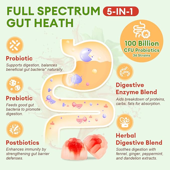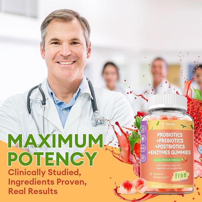 - Pre Post Probiotics Gummies 5-in-1: Totaria's Pre + Post + Probiotics Gummies combine the power of prebiotics (including inulin and fiber), probiotics, postbiotics, digestive enzymes, and potent herbs into one complete gut support solution. Every ingredient is carefully selected for its proven benefits in supporting digestive health and immune function.