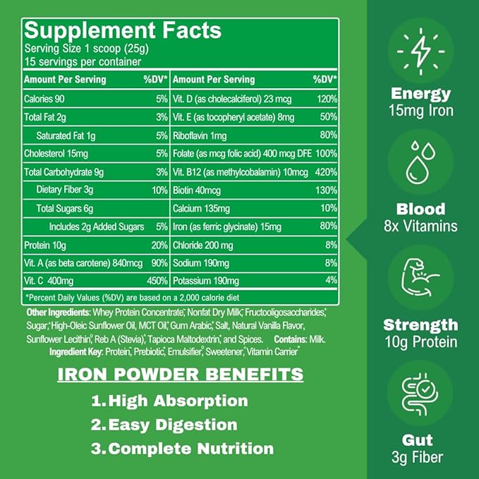 - ππ₯π’π‘ π£π’πͺπππ₯ π¦π¨π£π£πππ ππ‘π§ - 15mg iron per serving, with protein and vitamins to help boost hemoglobin and ferritin levels.