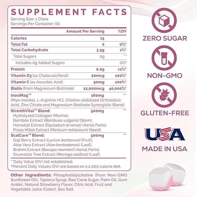 - Delicious Strawberry Soft Chews: Juicy strawberry flavor in every bite. This soft chew hair vitamin is easy to take, gentle on digestion, and fits any routine. No pills—just one a day for 60 days of clean beauty with trusted hair growth supplements
