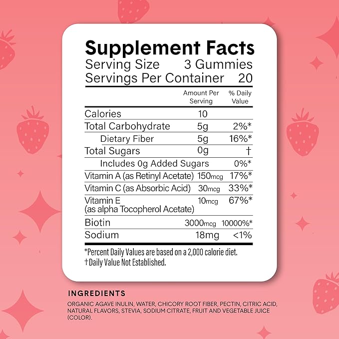 - Daily High Fiber Supplement: Ditch powders and tablets, our high fiber gummies are an easy, tasty way to get your daily fiber and biotin intake for women and men, supporting gut health, skin glow, and healthy hair.