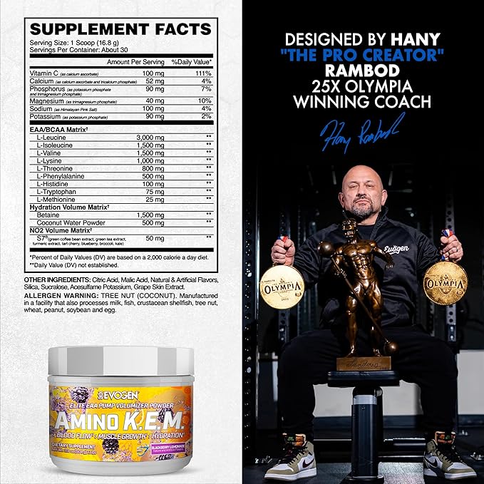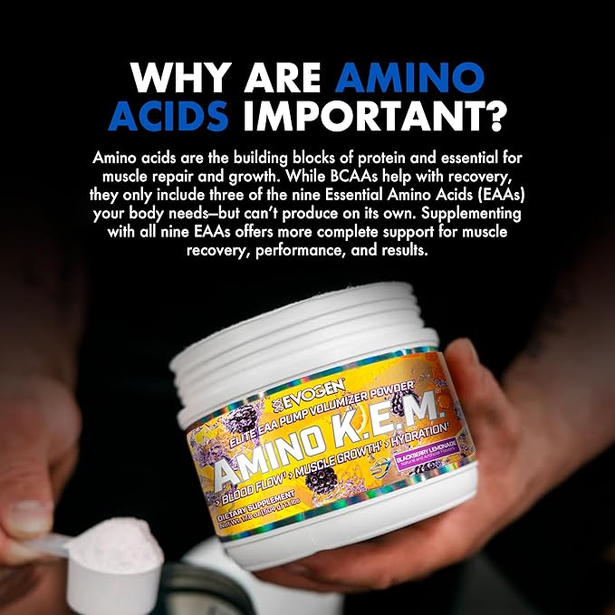 Evogen Amino K.E.M. - EAA & BCAA Powder Pump Volumizer | BCAAs Amino Acids Supplement for Blood Flow, Muscle Growth, & Hydration | BlackBerry Lemonade | 30 Servings