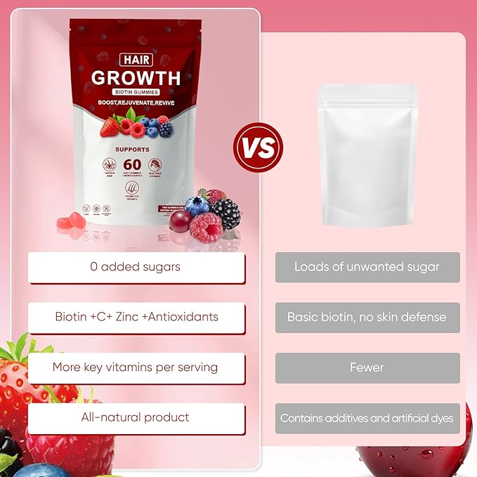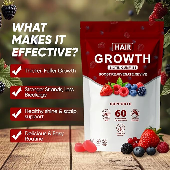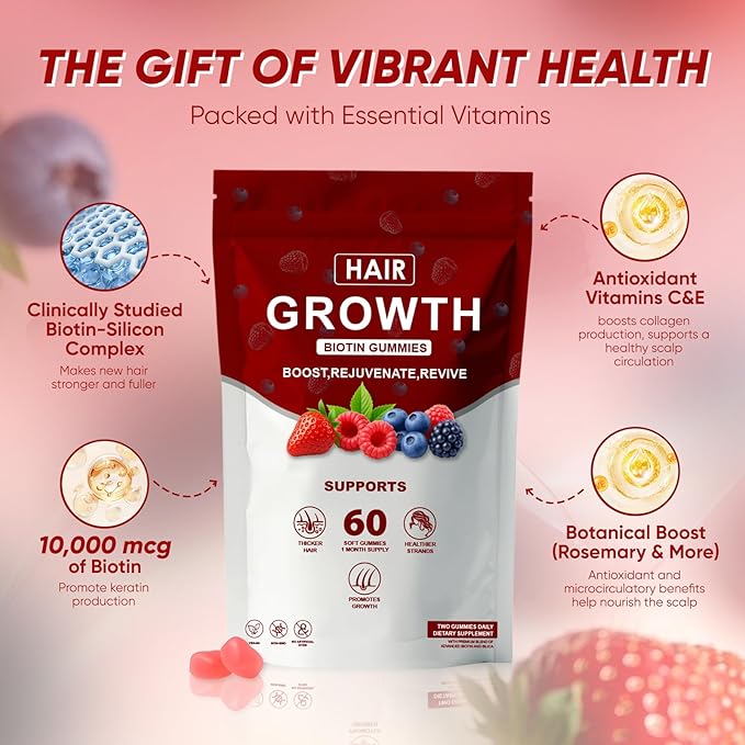 - Powerful Nutrient Blend Infused with biotin, essential vitamins, and plant extracts, these gummies deliver a targeted mix to support healthy hair. The synergistic formula works to nourish from within, laying the groundwork for stronger, more resilient locks.