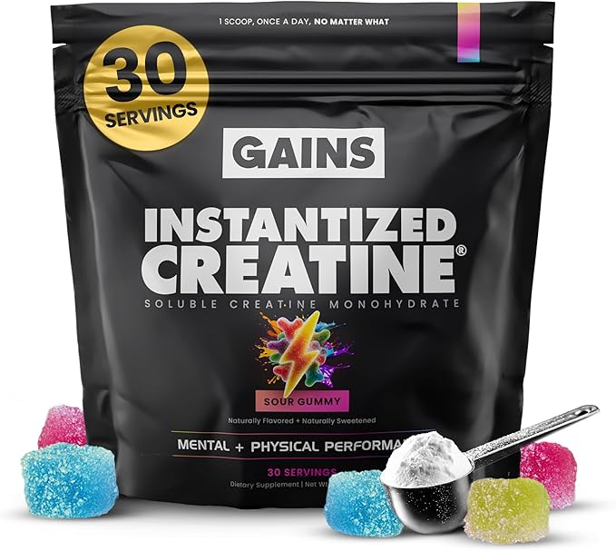 Gains in Bulk Instantized Creatine Monohydrate for Women and Men, Soluble Pre Workout Powder, Supports Muscle Building, Strength and Performance, Bodybuilding Supplements, Sour Gummy, 30 Servings
