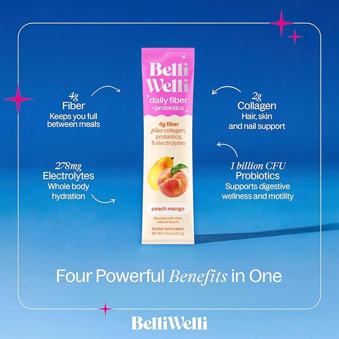 - 4-in-1 Daily Wellness Packets – Each travel pack combines prebiotic fiber, collagen peptides, probiotics, and electrolytes for hydration, metabolism, skin, and digestive health—anytime, anywhere.