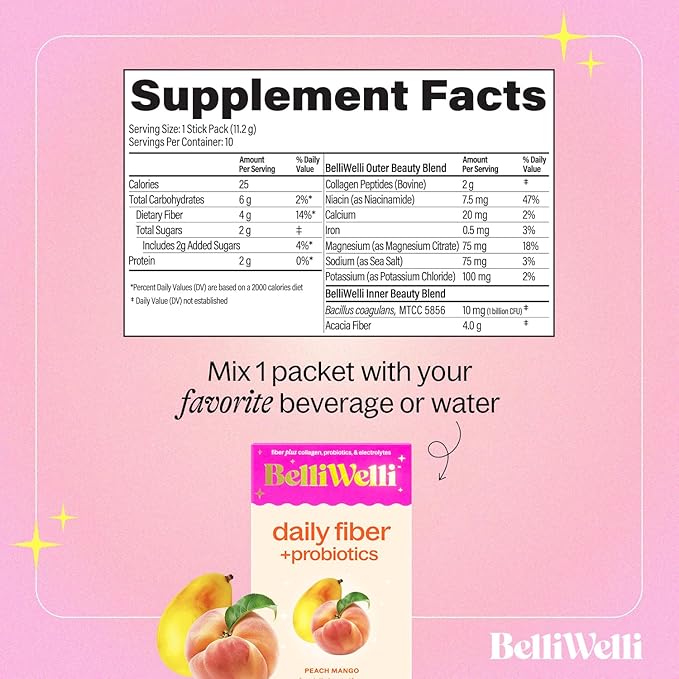 Fiber Supplement, Probiotics Fiber Powder Travel Pack for Women with Collagen & Electrolytes for Daily Gut Health & Debloating, Peach Mango, 10 Packets